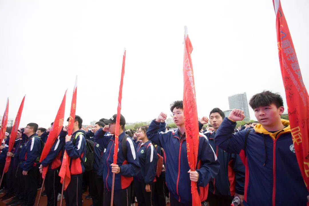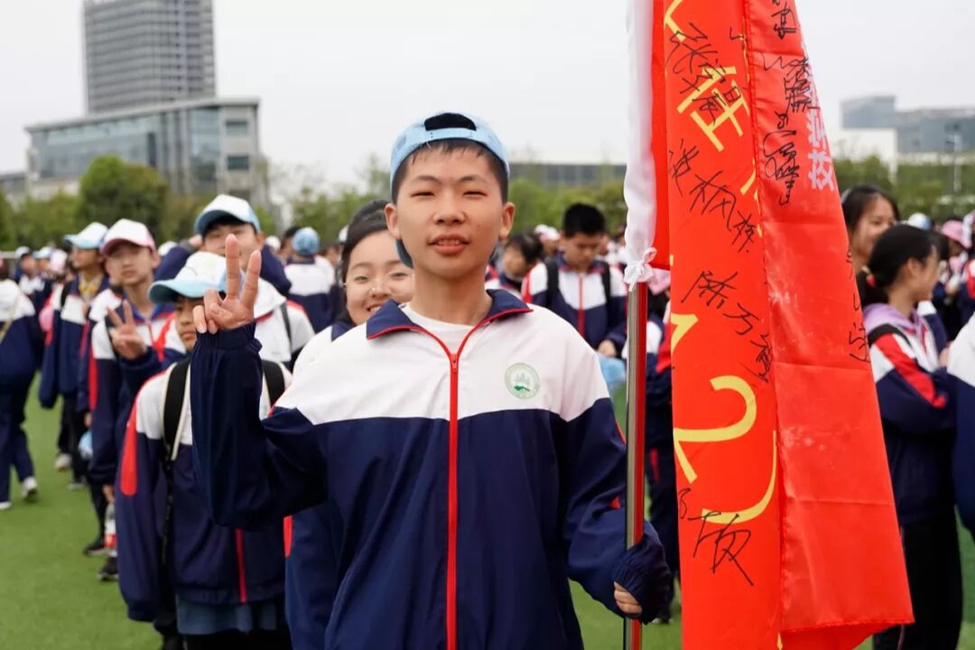 号角吹响 6点15,云朵聚在一起挡住了太阳,为大地带来阵阵寒意,满怀热情的同学们已经早早聚集到学校操场,等待45Km远足拉练动员大会这一激动人心时刻的到来。6点半,45Km远足拉练课程动员大会正式开始,丁继强副校长强调了拉练注意事项,王沛栋副校长对全体师生进行了课程培训和发动;随后,校学生会学生代表潘田勇带领全体同学进行宣誓,“天行健,君子以自强不息”、“挑战生命极限 放大生命光芒”、“我行,我能行,我一定行”,鲜红的旗帜在天空飘荡,嘹亮的声音响彻整个校园,铮铮誓言展示着同学们的自信,孩子们满怀期待,快乐远航。 集体宣誓 队伍出发 雄心壮志